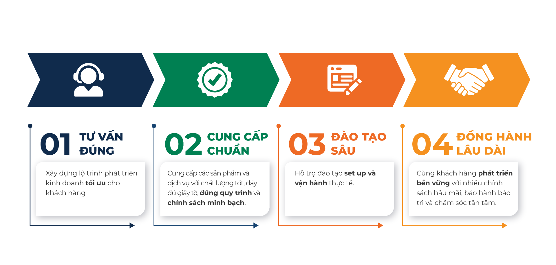 Mỗi bước trong hành trình – từ tư vấn, cung cấp, đào tạo đến vận hành – đều được chuẩn hóa thành các giải pháp cụ thể, giúp khách hàng dễ dàng áp dụng, kiểm soát và tối ưu trong từng giai đoạn phát triển.